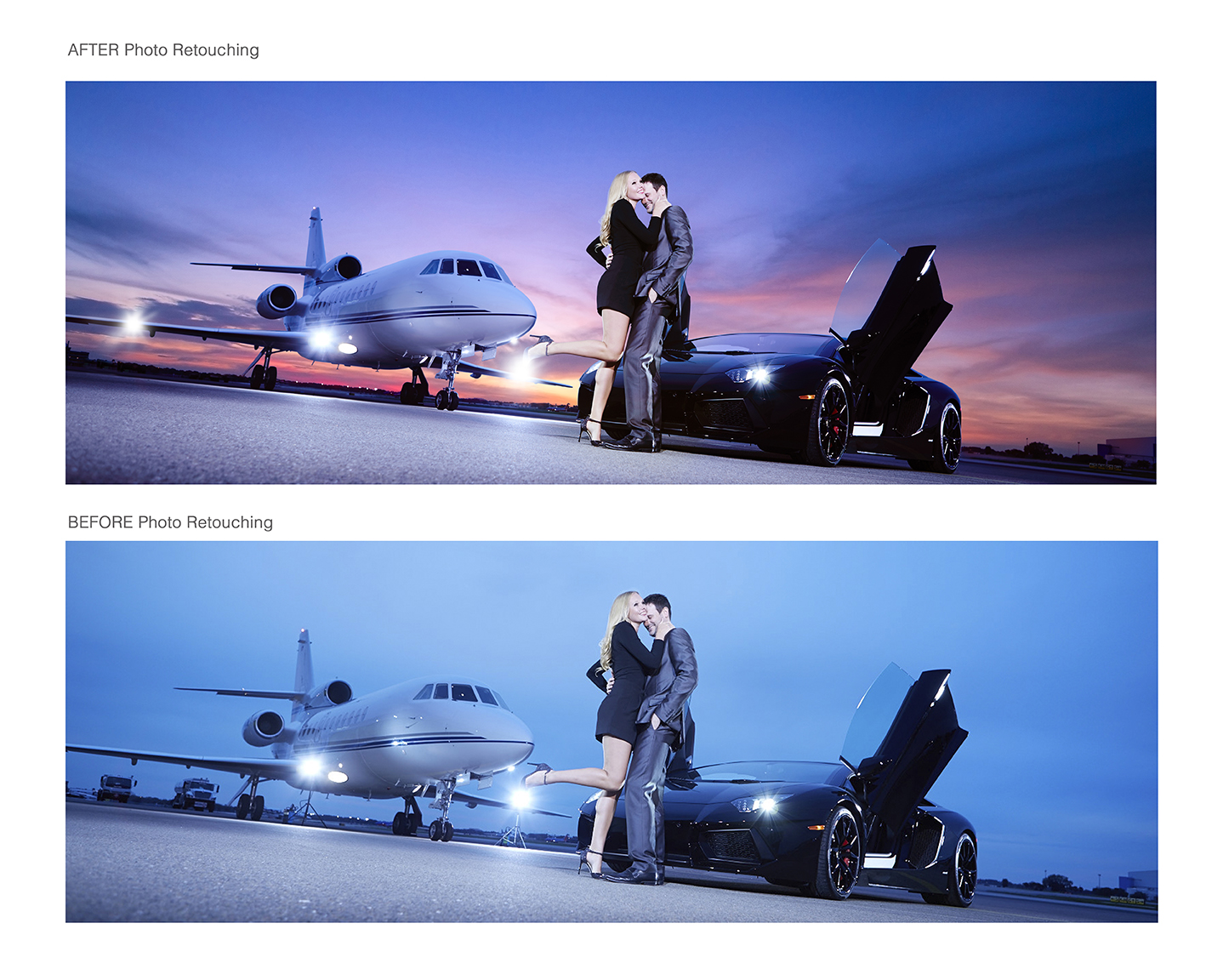 This image was shot for a website series of lifestyle sliders. In this shot I secured the models, aircraft, Lamborghini, along with a crew and photographer. Everything but the weather, which was cold and starting to rain. Here you see the results of the extensive photoshop retouching.